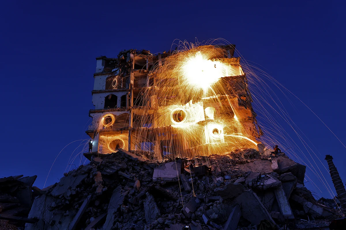 Displaced Palestinians play with fireworks after breaking their fast, inside a damaged building at the Jabalia refugee camp in the northern Gaza Strip, during the Muslim holy fasting month of Ramadan, on February 23, 2026. A displaced Palestinian plays with...